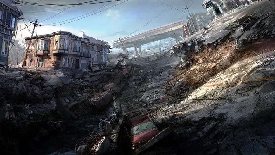 A city had grown around me. Silent. Ruined. Buildings stood like broken teeth, blast patterns radiating from some central catastrophe. Scrawny vegetation pushed through cracked pavement. The sky was the wrong color—too much UV getting through, atmospheric damage on a scale that spoke of cascading ecosystem collapse.