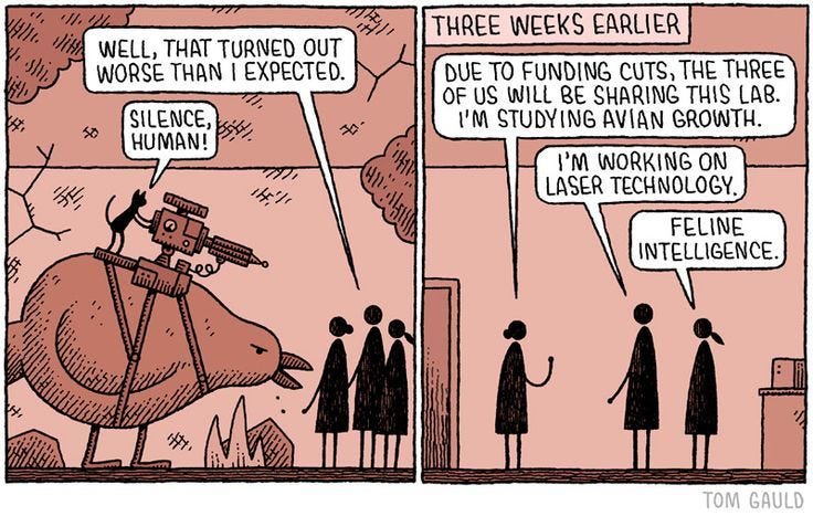 Inspired by Tom Gauld’s cartoon about scientists forced to share a laboratory due to funding cuts, where competing projects in avian growth, laser technology, and feline intelligence inevitably interfere with catastrophic results. What began as Gauld’s characteristic deadpan commentary on institutional dysfunction became this meditation on the tragedy of brilliance without proper infrastructure—and what happens when we enhance apex predators without considering the consequences.